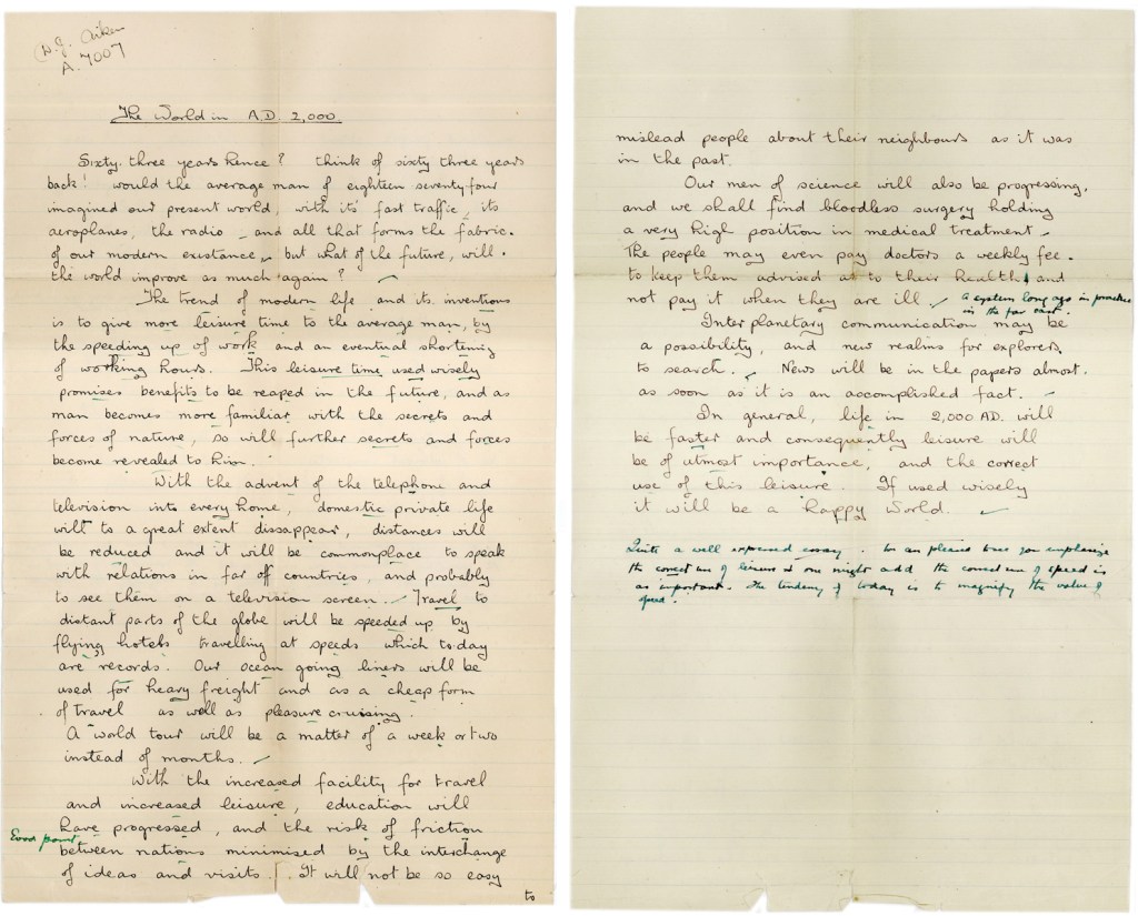 In an exercise set by the Pelman Institute in 1937, my father imagined how the world might be in the year 2000. I have included a transcript below.